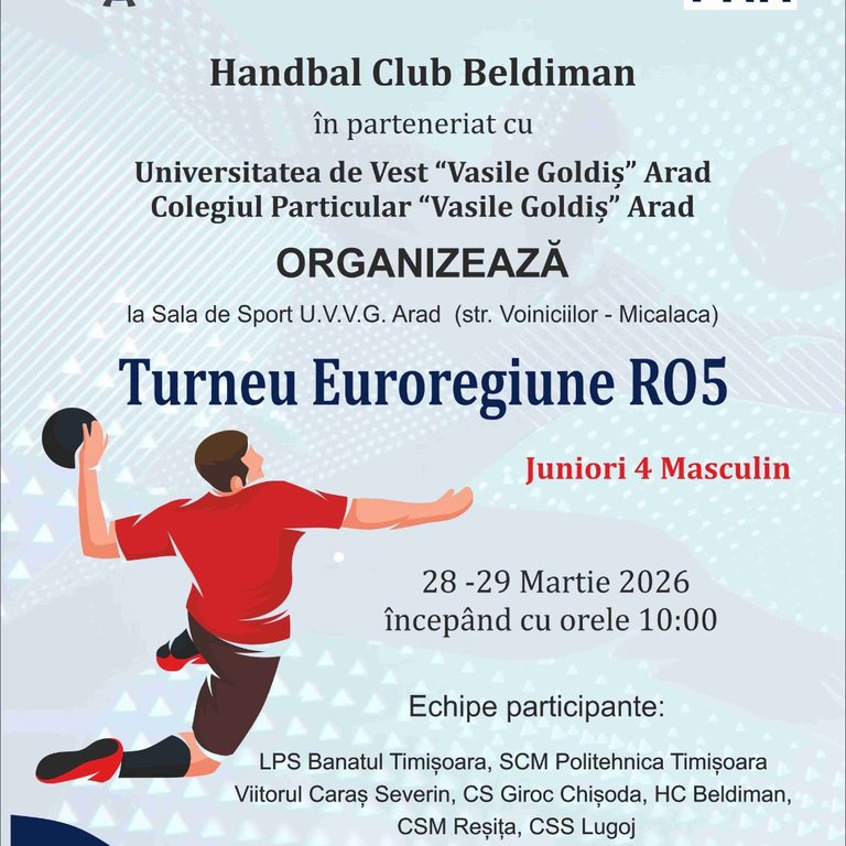 Sportul cu mingea pe semicerc va fi în centrul atenției în acest weekend, sâmbătă și duminică, începând cu ora 10, la sala de sport UVVG, situată pe strada Voinicilor din Micălaca. Handbal Club Beldiman Arad organizează Turneul Euroregiune RO5 – Juniori 4 Masculin, un eveniment dedicat tinerelor talente din lumea handbalului.